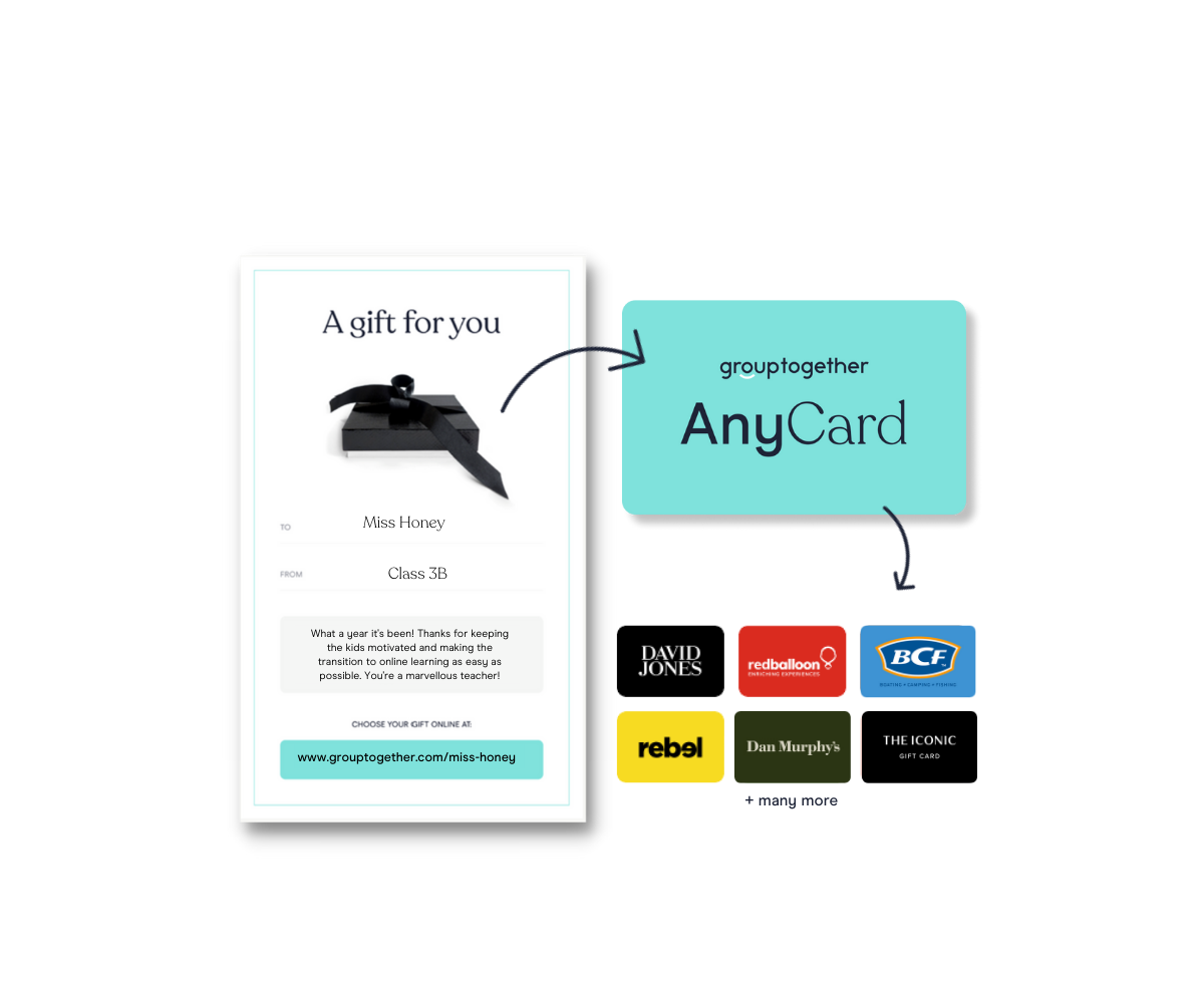 Okay, this one’s totally optional, but it does add a whole lot of pizazz when you attach an eGift Card to your group card. With GroupTogether, everyone can contribute any amount – and a little from everyone adds up to a lot. With the AnyCard, the teacher can choose how to spend it with 100+ retailer options. Whether it’s a $5, $10 or $50 AnyCard, it’s the thought that counts and the flexibility that makes all the difference.