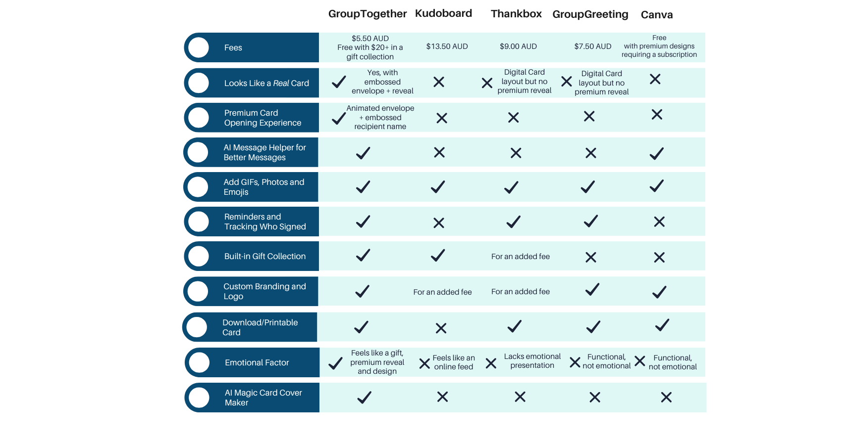 Cost: At first glance, some digital birthday card platforms appear cheaper, with starting prices around $4.99 to $9.99 AUD – but price alone doesn’t tell the full story. GroupTogether costs $5.50, landing comfortably in the middle while offering significantly more value for one flat price (including unlimited messages). For contrast, Kudoboard’s Premium Board starts at around $13.50, while Thankbox ranges from roughly $9.00 to $15.00, depending on the plan. Unlike competitors that require higher-tier plans for basic features or add extra fees later, GroupTogether includes premium presentation, personalisation and gifting tools upfront. The result is a platform that feels thoughtfully priced rather than stripped back.