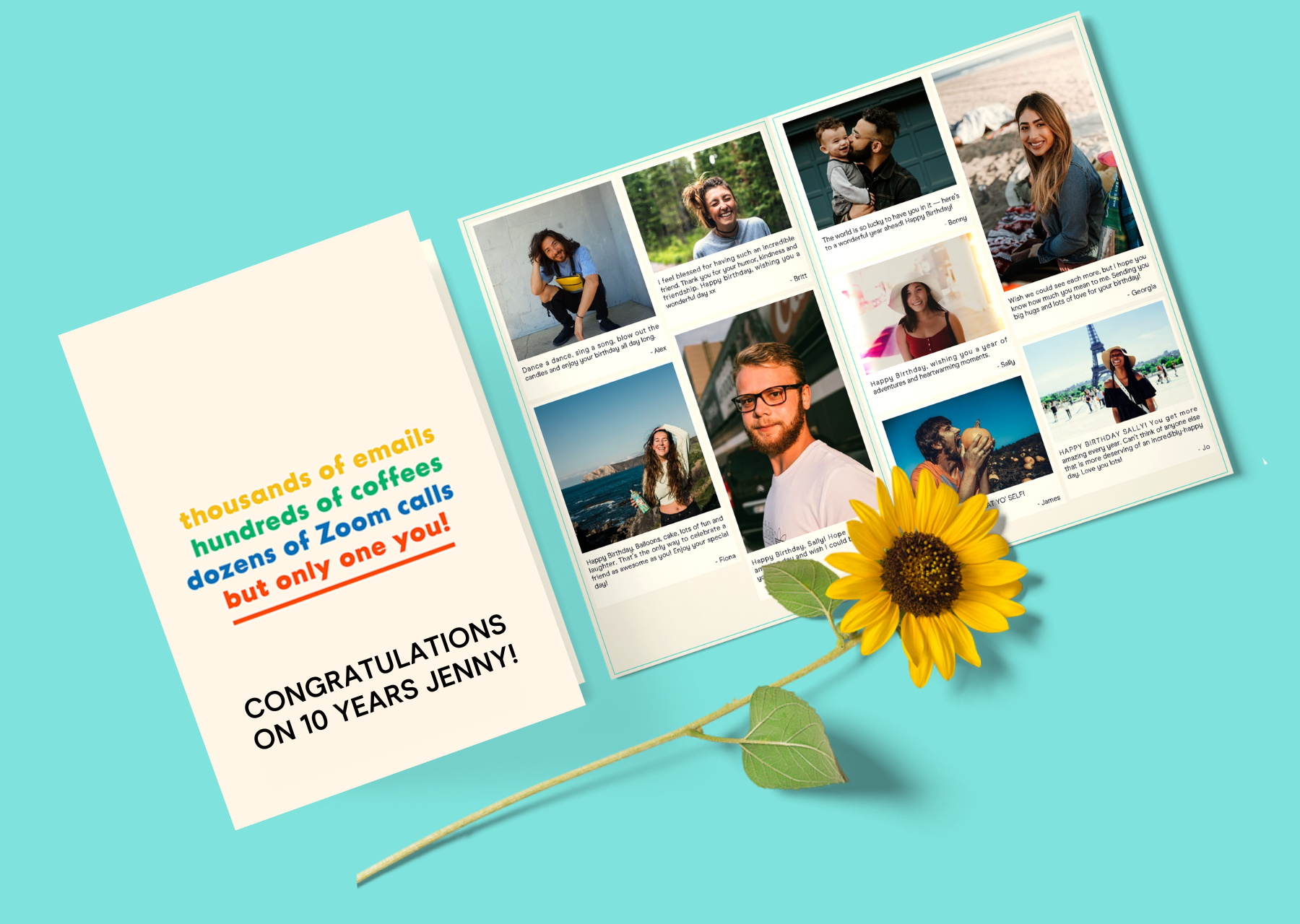 A group card signed by the team turns the anniversary into a celebration. Instead of one message from a manager, the employee receives notes from teammates across the business – recognising effort, impact and personality.